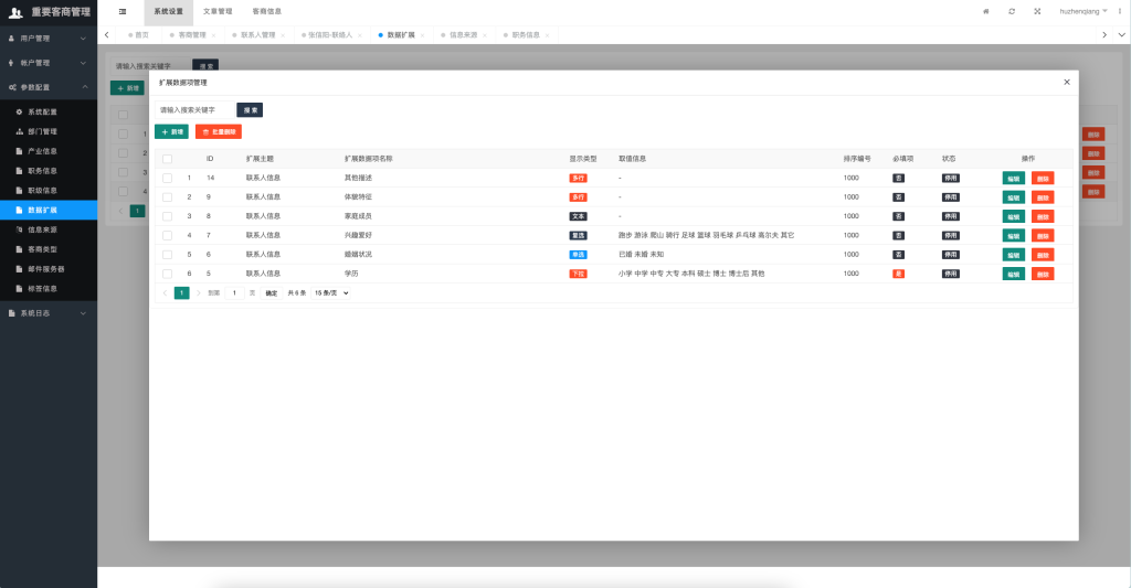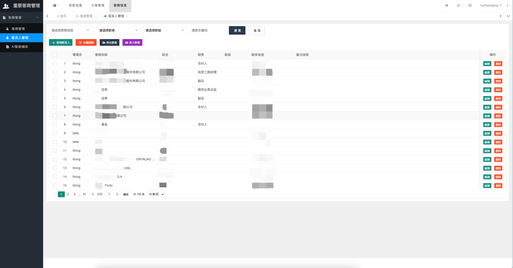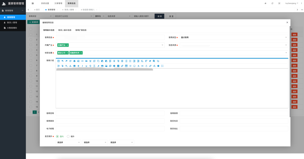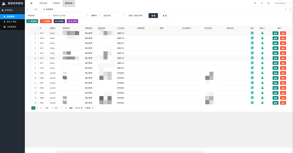 1、客户信息管理:集中存储和管理客户的基本信息,包括但不限于姓名、联系方式、企业规模、业务领域、偏好等。支持信息的添加、编辑、删除和批量导入导出,方便企业快速录入和更新客户资料。