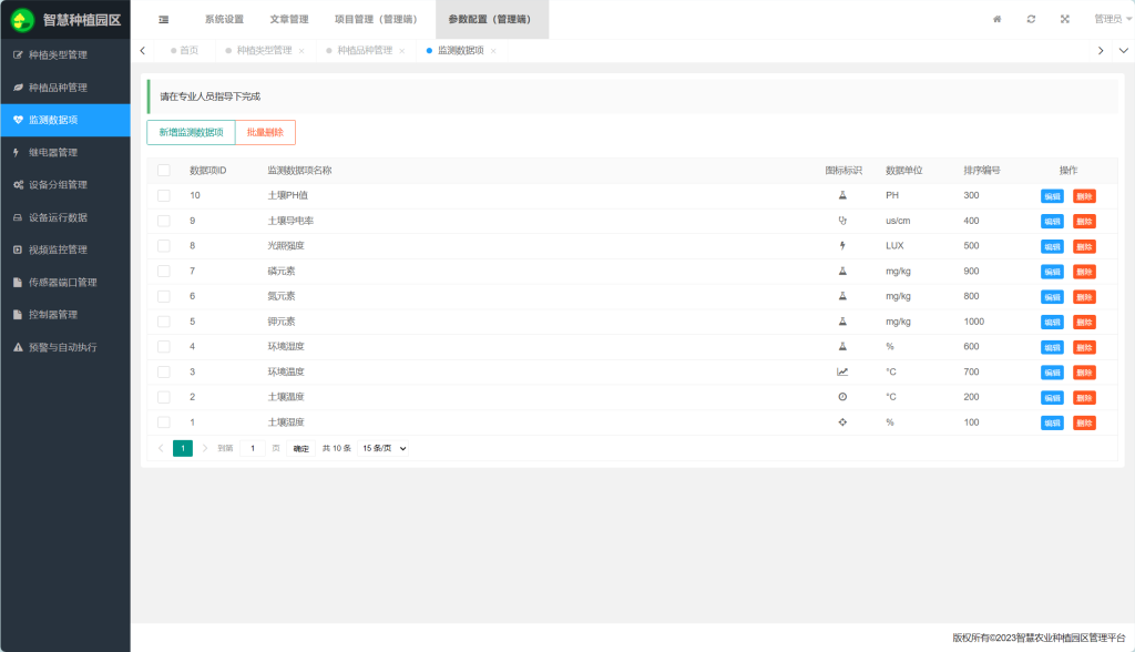 5.5、传感器端口管理:注册和配置传感器设备,采集数据,实时展示和记录历史数据,监控设备状态,分析数据并预警,与其他模块数据交互,设置权限管理,为农业生产决策提供数据支持。