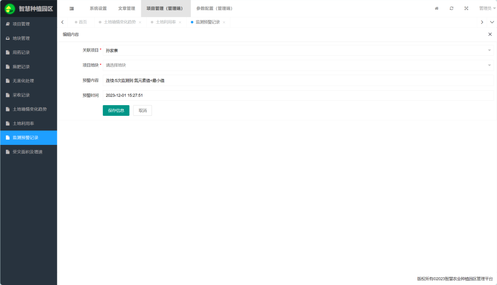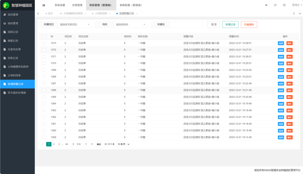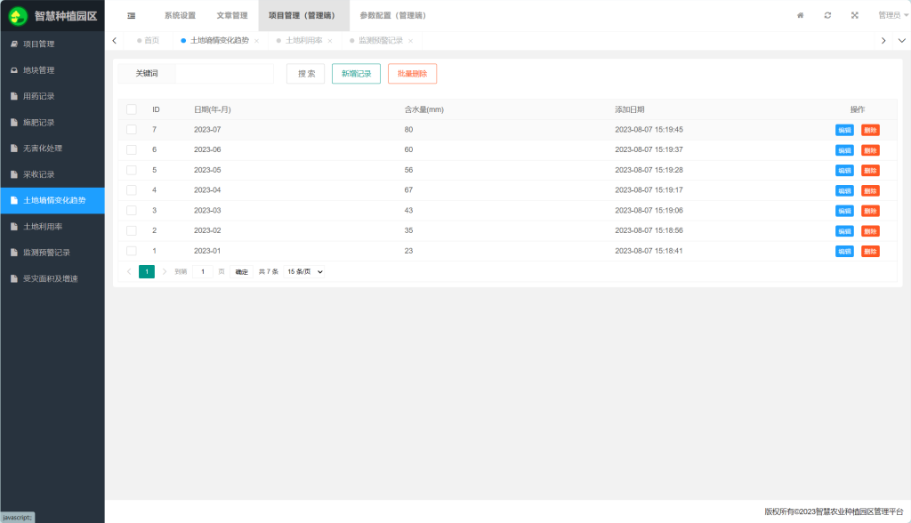 3.1、监测预警记录:记录气象、土壤墒情、作物生长、农业设备运行等各类监测数据,以及气象灾害、病虫害、土壤墒情异常等预警信息,进行数据分析,记录重要事件,以图表、曲线、地图可视化展示数据,为农业生产提供决策参考。