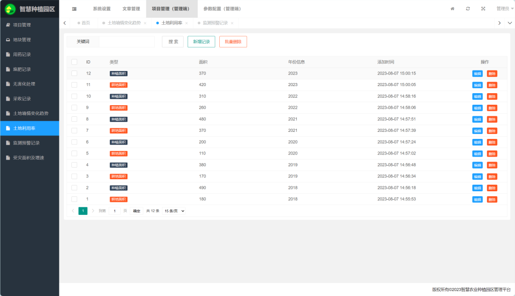 2.2、土地利用率:实时监测农田、林地、草地等各类土地的利用情况,采集并存储土地利用相关数据,分析各类作物种植面积占比和土地利用结构变化趋势,结合其他农业数据提供决策支持,以图表、地图可视化展示数据。