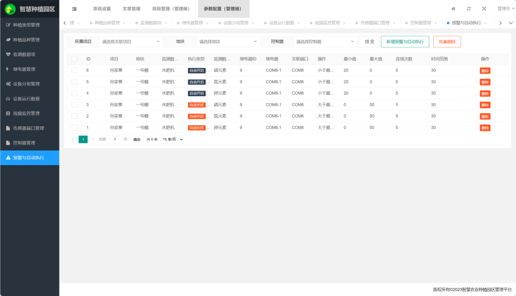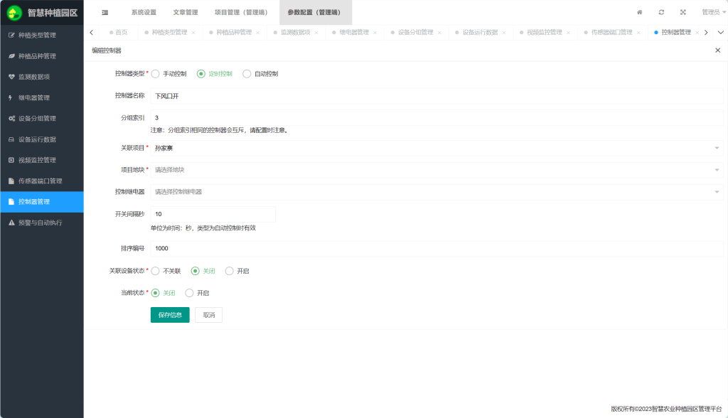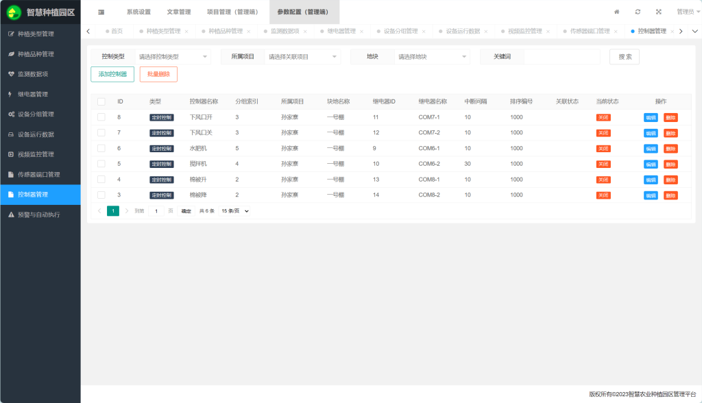 5.6、控制器管理:注册和配置控制器设备,监控设备状态,支持远程操作和定时任务,与传感器数据联动,记录分析数据,远程监控报警,设置权限管理,实现农业生产环境智能化控制。