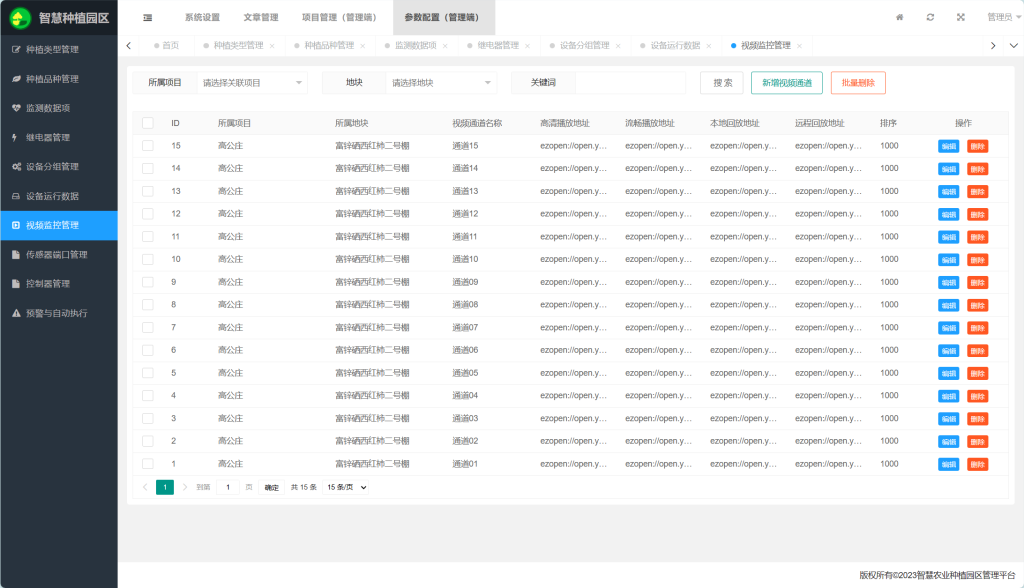 5.4、视频监控管理:管理视频设备,实时监控农业生产场景,支持录像回放,远程控制设备,监测报警异常情况,存储管理视频数据,进行视频分析和智能识别,设置权限管理。