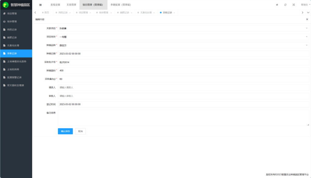 1.3、采收记录:精确记录作物或畜禽的采收时间、采收量、采收地点和采收人员,通过数据统计分析生成报表或图表,为生产管理和决策提供数据支持,并以图表或地图形式直观展示,方便用户了解采收情况。