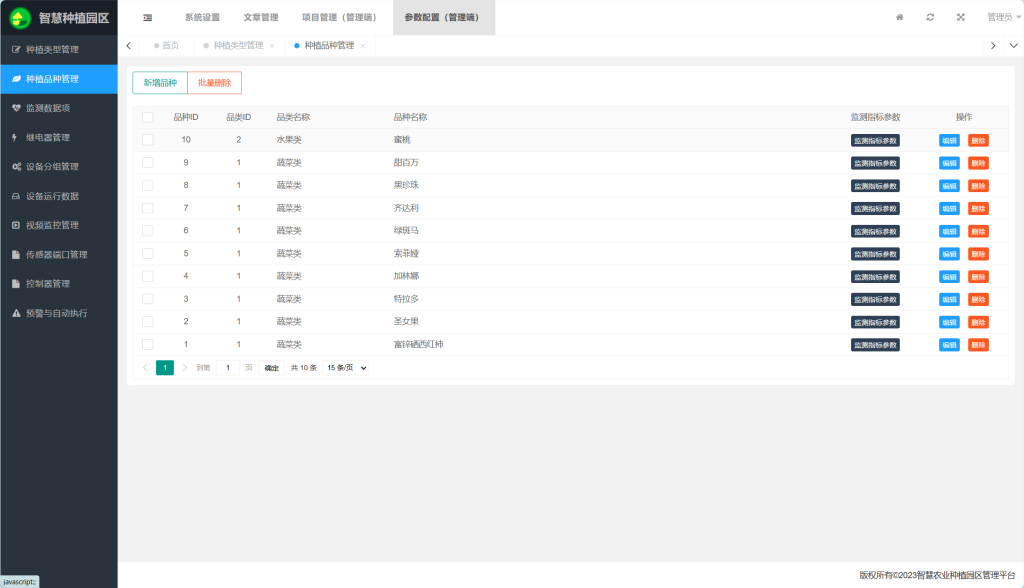 4.2、种植品种管理:录入农作物品种信息,分类管理品种,提供种植指导信息,比较分析品种特性,记录种子信息,统计分析种植情况,生成报告,促进品种推广和交流,推动农业产业发展。