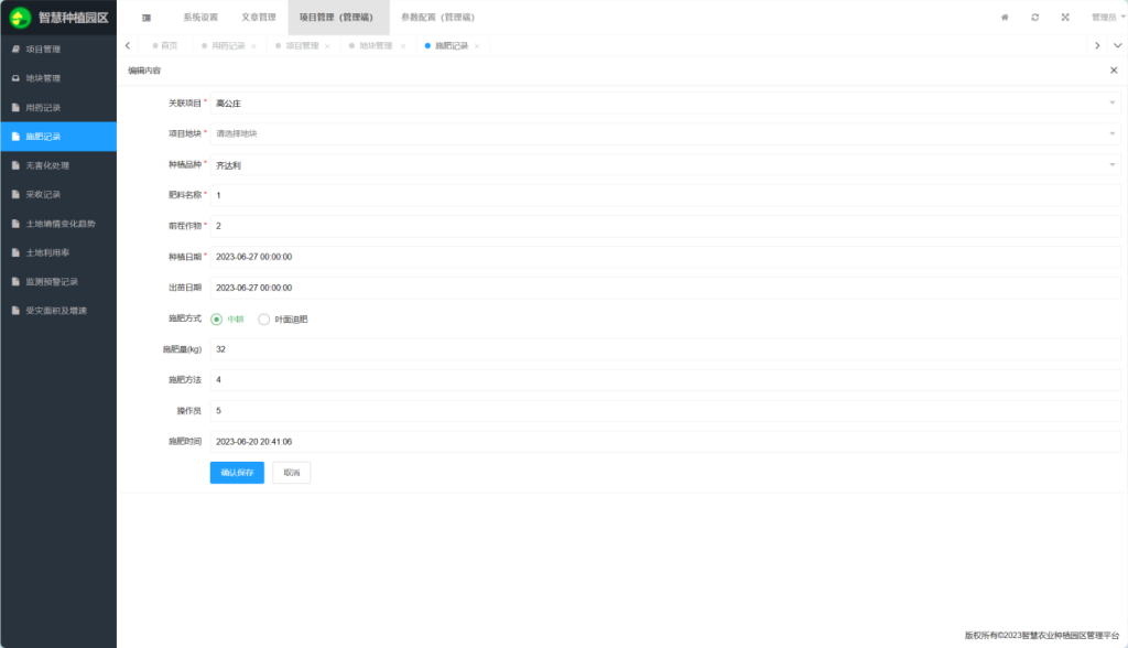 1.2、施肥记录:记录施肥的时间、肥料种类、用量、施肥地点等信息,点击详情按钮可查看项目详细信息,助力合理施肥,提高土壤肥力和作物产量。