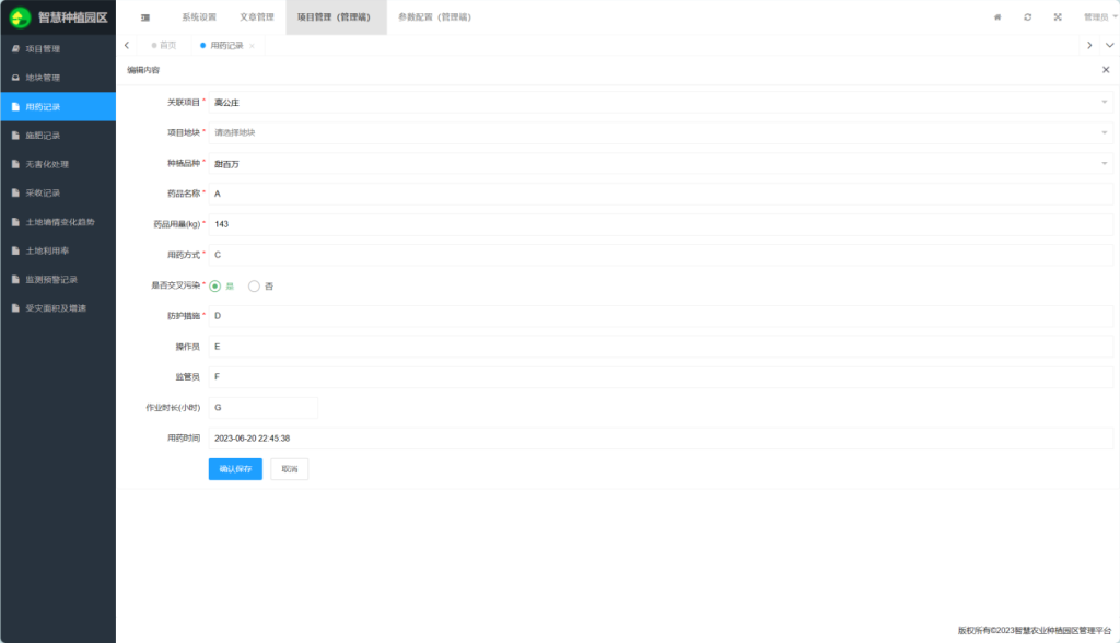 2、保障农产品质量安全:规范用药、施肥记录和管理,严格控制药物和肥料使用,确保农产品质量符合安全标准。