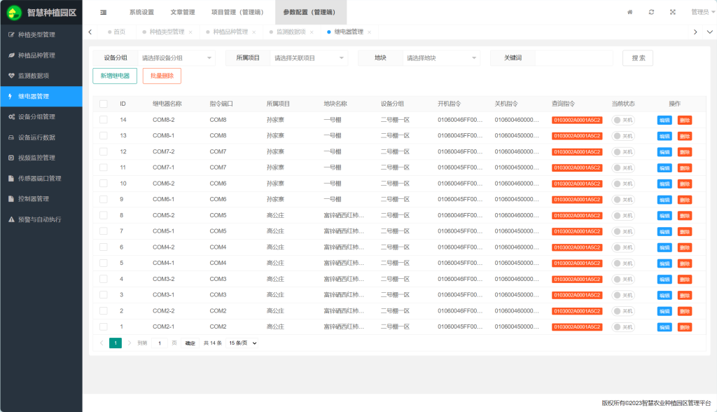 5.1、继电器管理:接入和配置继电器设备,实现远程控制,设置定时任务,与监测数据项模块联动,监测设备运行状态,统计能耗并提供优化建议,保障农业生产自动化和稳定性。