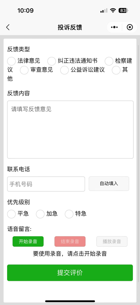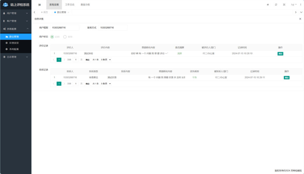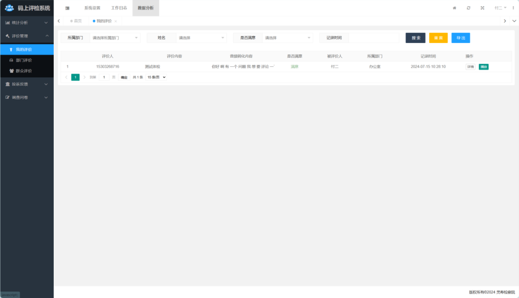 7、评价管理:可查看群众对个人和部门的评价信息,支持录音转文字,具备详情查看、播放、查询和导出功能,管理员拥有全部查看权限。
