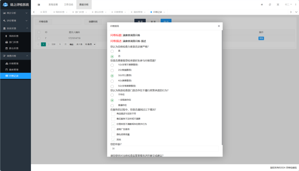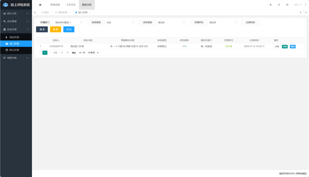 5、促进沟通反馈:评价和反馈管理功能,促进群众与内部人员沟通交流,及时解决问题。尤其在评价方面,录音转文字功能方便处理评价信息,统计分析能直观呈现评价趋势;反馈管理的承接、办结功能,让问题处理流程更规范;调查问卷管理可便捷创建、管理问卷,统计分析助力了解群众意见,为决策提供依据 。