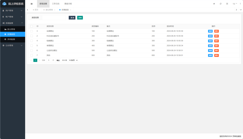 4、参数配置:包含群众管理、反馈类型管理和系统配置,可管理群众扫码评价信息,限制恶意评价账号,设置反馈类型,维护系统基本信息。