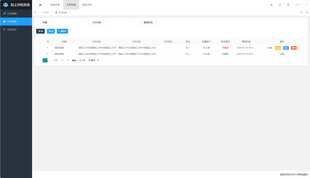 6、工作日志管理:支持职员填报日志,管理员可查看、编辑、删除未提交日志,批注已提交日志,还能按多种条件筛选日志。