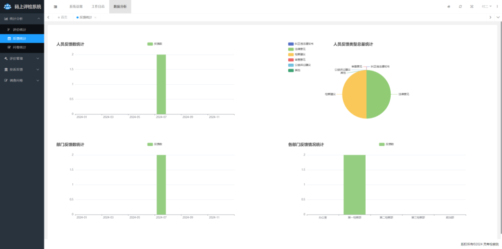 10、统计分析:从评价、反馈、问卷三方面进行统计,以柱形图、饼图展示不同月份群众对职员、部门的评价和反馈统计,以及问卷填报记录统计,直观呈现数据趋势。